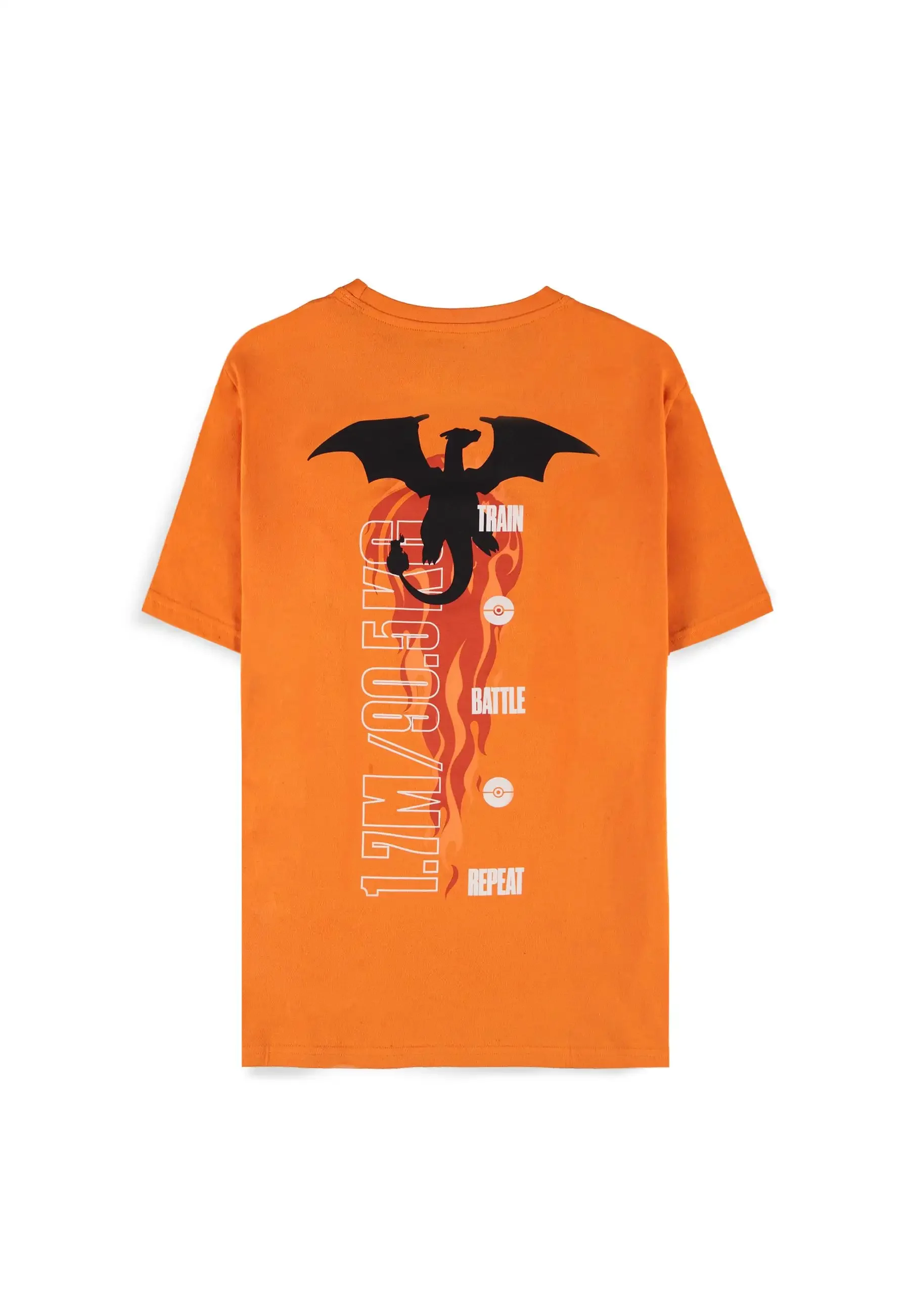 Oranžové tričko Pokémon - Charizard poteší všetkých trénerov, ktorí fandia ohnivým typom. Na hrudi má decentný Poké Ball s číslom #006, zatiaľ čo na chrbte septembra silueta Charizarda v plameňoch spolu s jeho výškou a váhou. Štýlové, energické a ideálne pre každodenné nosenie aj zápasy v Pokémon svete.Materiál: 100% bavlna