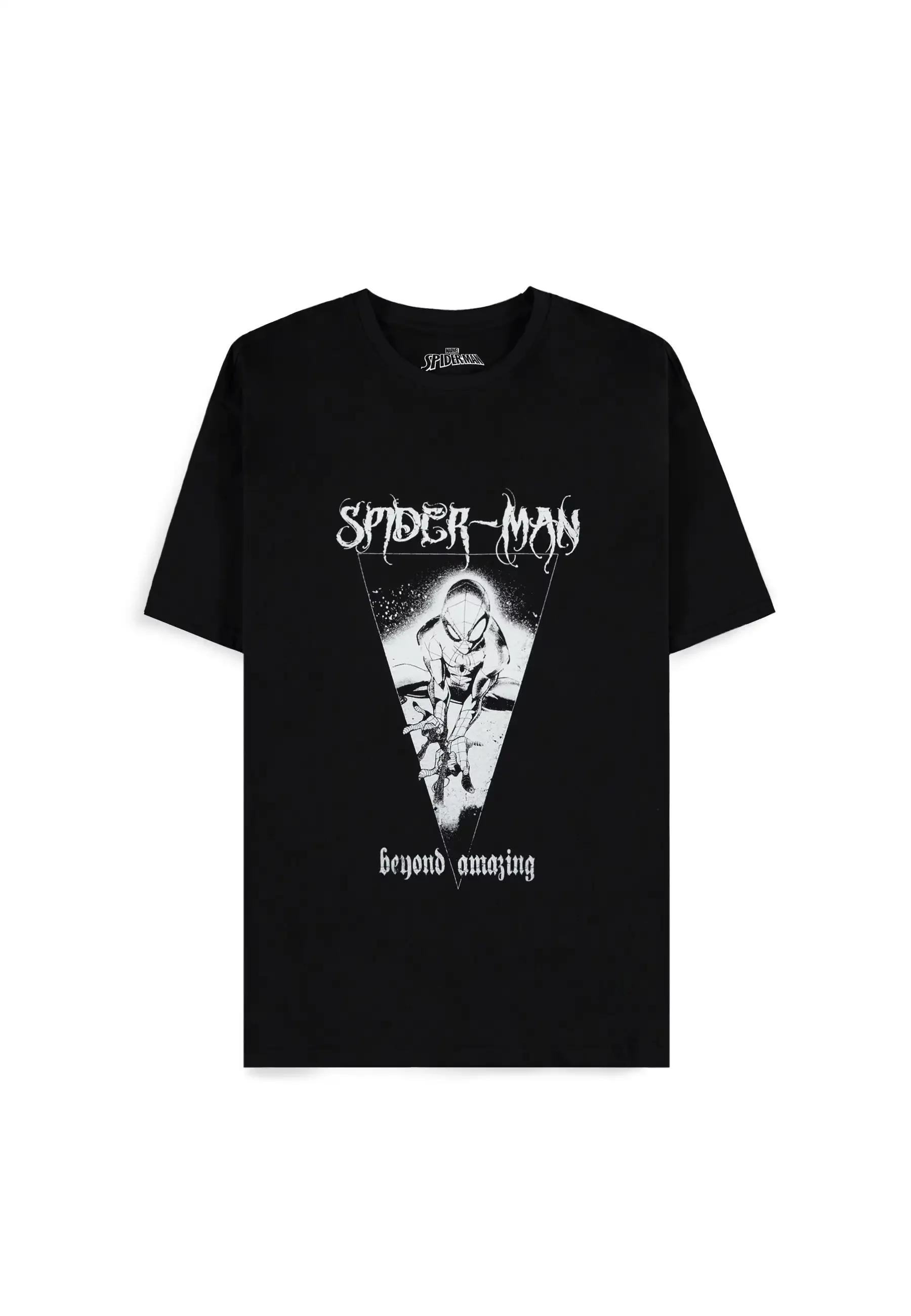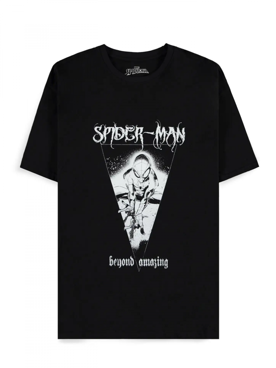 Čierne tričko Spider-Man - Beyond Amazing s výraznou monochromatickou potlačou pavúčieho hrdinu v akcii. Štýlový kontrast bieleho dizajnu na čiernom podklade pôsobí drsne a originálne – ideálny pre všetkých fanúšikov Spideyho, ktorí chcú ukázať svoj obdiv k ikone Marvelu.Materiál: 100% bavlna