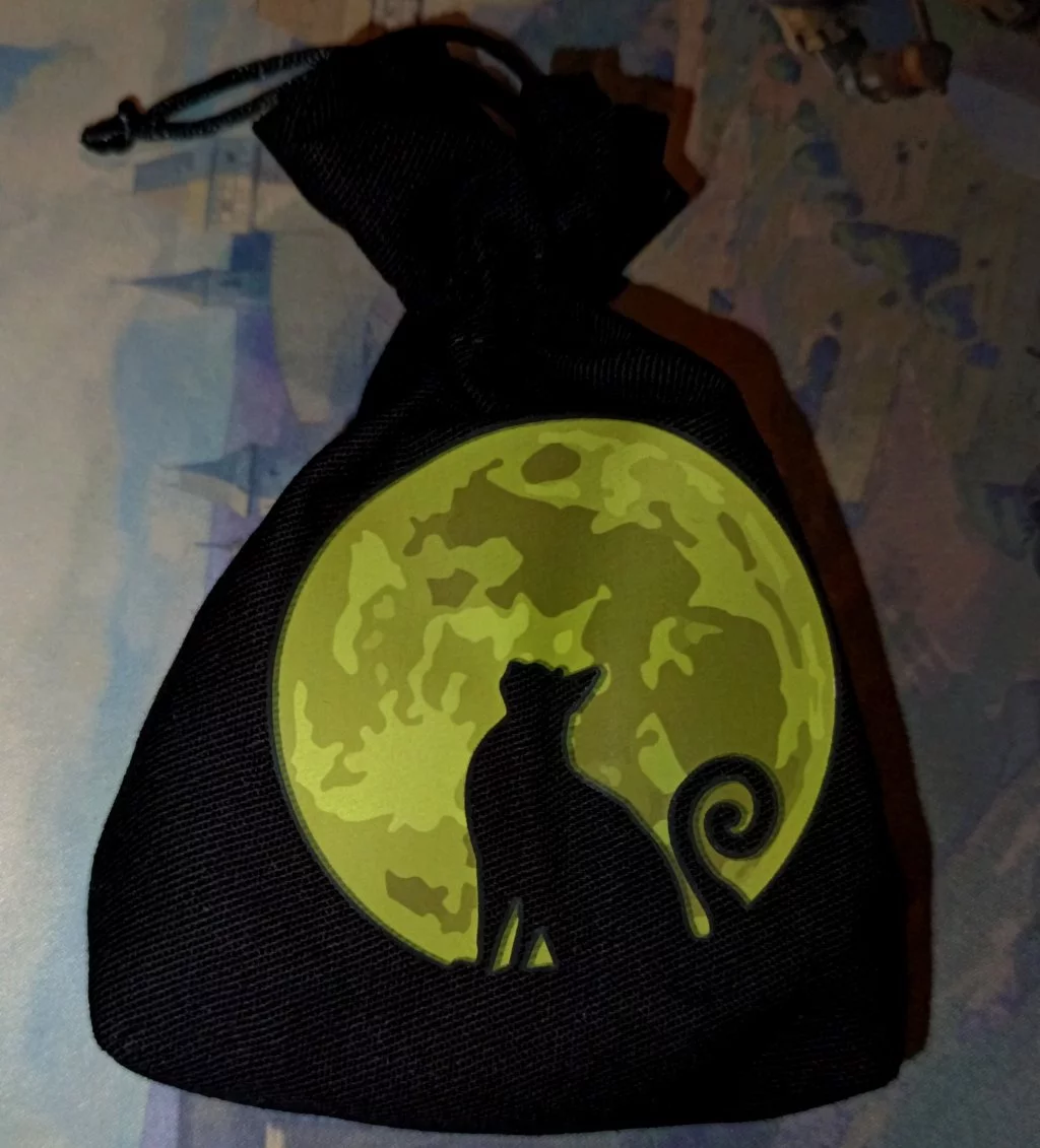 Vaše kocky potrebujú bezpečné útočisko, kde si môžu oddýchnuť. Toto vrecúško je schopné pojať až 9 kociek, oplýva uzatvárateľnou odolnou saténovou šnúrkou a je vyrobené zo silnej 400g bavlnenej tkaniny ktorá je odolná proti poškriabaniu. Potlač zobrazuje mačku v mesačnom svetle, ale tu mágia nekončí: mesiac, cez deň žltkastý, v tme modro žiari! Samozrejme po predchádzajúcom nabití UV svetlom.
